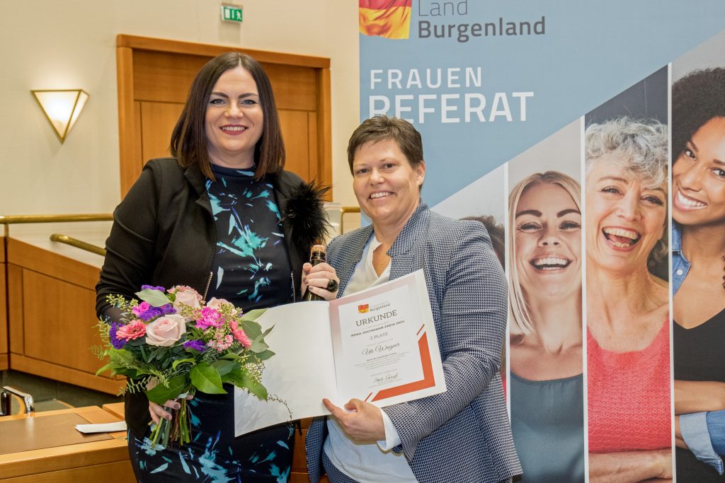 Bildtext Rosa-Jochmann-Preis 2: Die Zweitplatzierte Ute Wagner mit Landeshauptmann-Stellvertreterin Mag.a Astrid Eisenkopf.