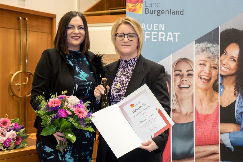 Bildtext Rosa-Jochmann-Preis 3: Die Drittplatzierte mit Landeshauptmann-Stellvertreterin Mag.a Astrid Eisenkopf.